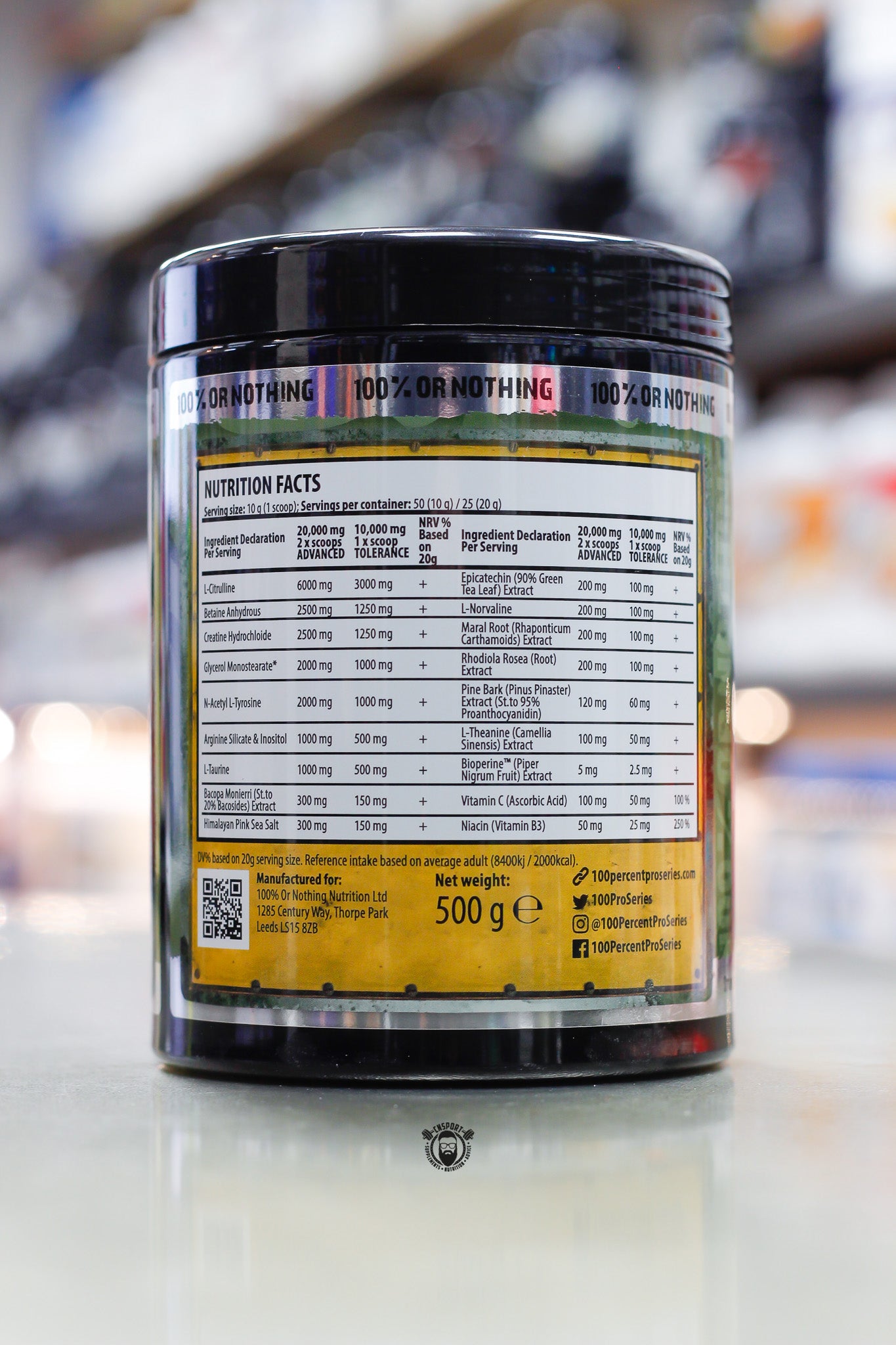 100% or Nothing Pro Series - Pump Action - 500g is classified as Intermediate intensity. This pre-workout is suitable for most users.