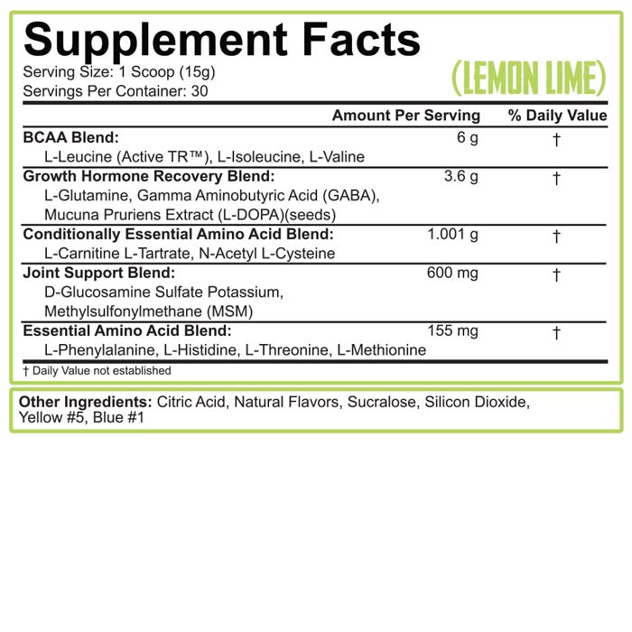 L-Leucine (Active TRβ’)L-IsoleucineL-ValineL-GlutamineGamma Aminobutyric Acid (GABA)Mucuna Pruriens Extract (L-DOPA)(seeds)L-Carnitine L-TartrateN-Acetyl L-CysteineD-Glucosamine Sulfate PotassiumMethylsulfonylmethane (MSM)L-PhenylalanineL-HistidineL-ThreonineL-Methionine