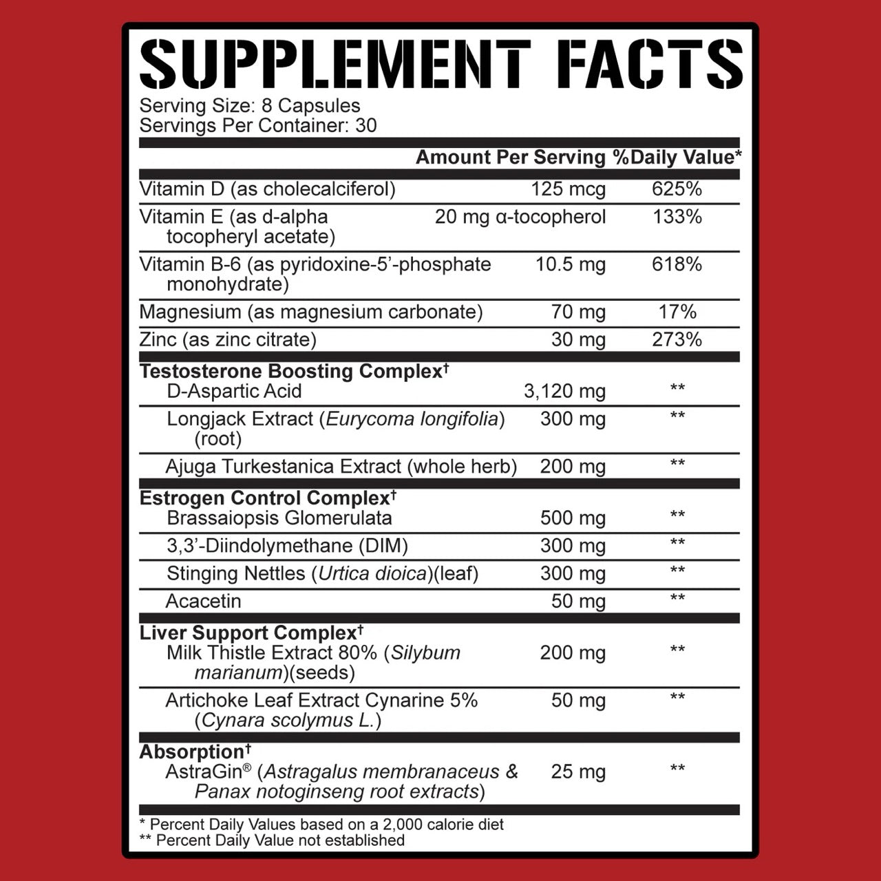 D-Aspartic AcidLongjack Extract (Eurycoma longifolia) (root)Ajuga Turkestanica Extract (whole herb)Brassiopsis Glomerulata3,3'-Diindolylmethane (DIM)Stinging Nettles (Urtica dioica)(leaf)AcacetinMilk Thistle Extract 80% (Silybum marianum)(seeds)Artichoke Leaf Extract Cynarine 5% (Cynara scolymus L.)AstraGin® (Astragalus membranaceus & Panax notoginseng root extracts)