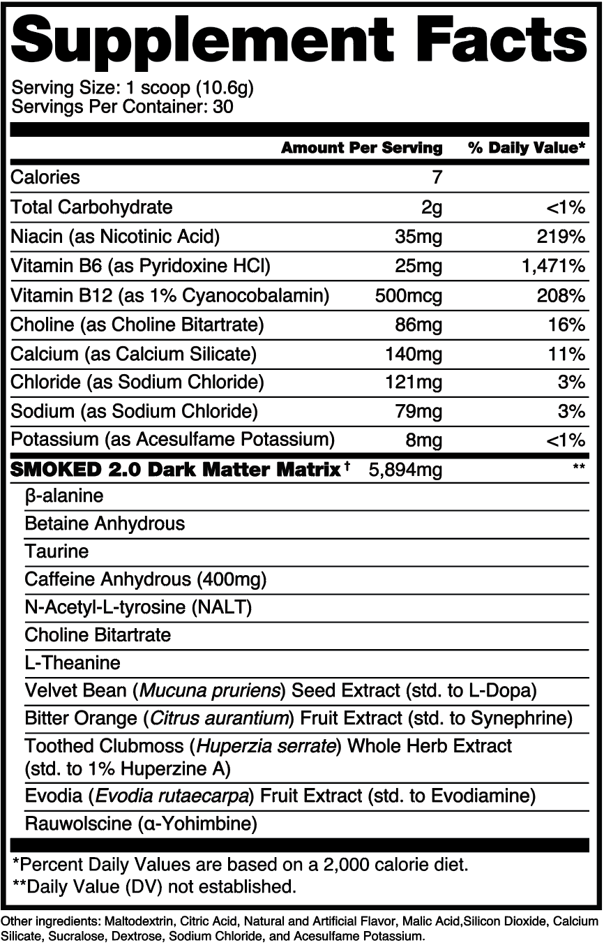 Smoked 2.0 Pre-Workout contains 400mg of total caffeine per serving.