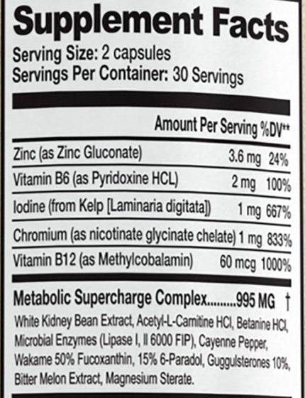 White Kidney Bean ExtractAcetyl-L-Carnitine HClBetanine HClMicrobial Enzymes (Lipase I, II 6000 FIP)Cayenne PepperWakame 50% Fucoxanthin15% 6-ParadolGuggulsterones 10%Bitter Melon ExtractMagnesium Sterate