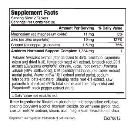Tribulus terrestris extract (standardized to 45% furostanol saponins) (stem and dried fruit)fenugreek seed 4:1 extractlongjack root 20:1 extract (Eurycoma longifolia)chrysinkudzu root extract (Pueraria lobata) (40% isoflavones)DIM (diindolylmethane)red clover extract (aerial parts)Avena sativa 10:1 extract (aerial parts)sodium tetraboratebeta-sitosterolstinging nettle root 4:1 extractsaw palmetto fruit extract (90% total sterols and free fatty acids)Bioperine® black pepper extract (fruit)