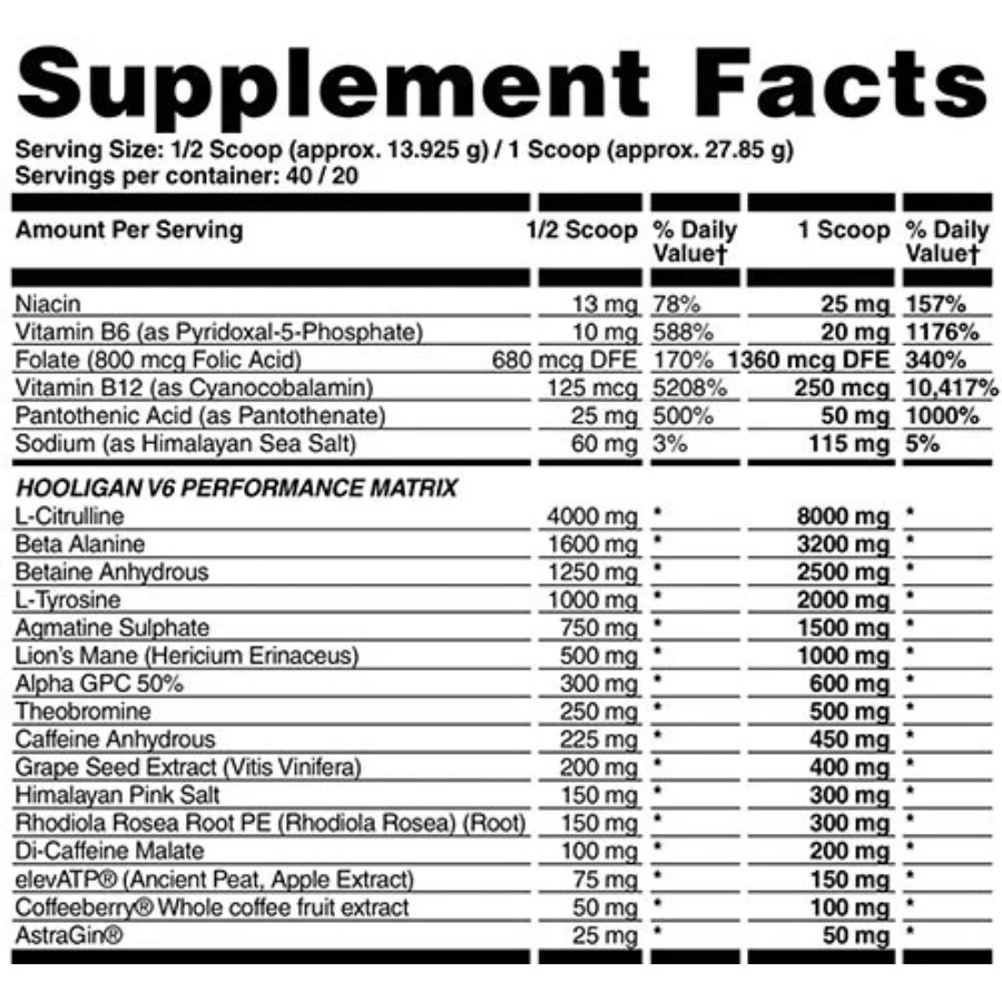 apollon nutrition hooligan v6 40 servings contains 600mg of total caffeine per serving.