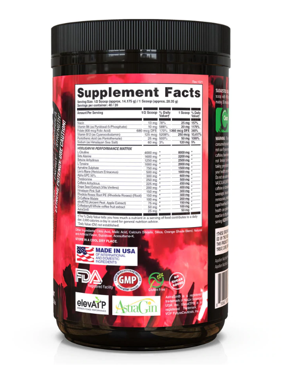 - Hooligan delivers a strong, high-stimulant experience, ideal for those seeking intense focus and energy for their workouts.