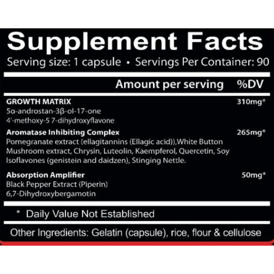5α-androstan-3β-ol-17-one4'-methoxy-5 7-dihydroxyflavonePomegranate extract (ellagitannins (Ellagic acid))White Button Mushroom extractChrysinLuteolinKaempferolQuercetinSoy Isoflavones (genistein and daidzen)Stinging NettleBlack Pepper Extract (Piperin)6,7-Dihydroxybergamotin