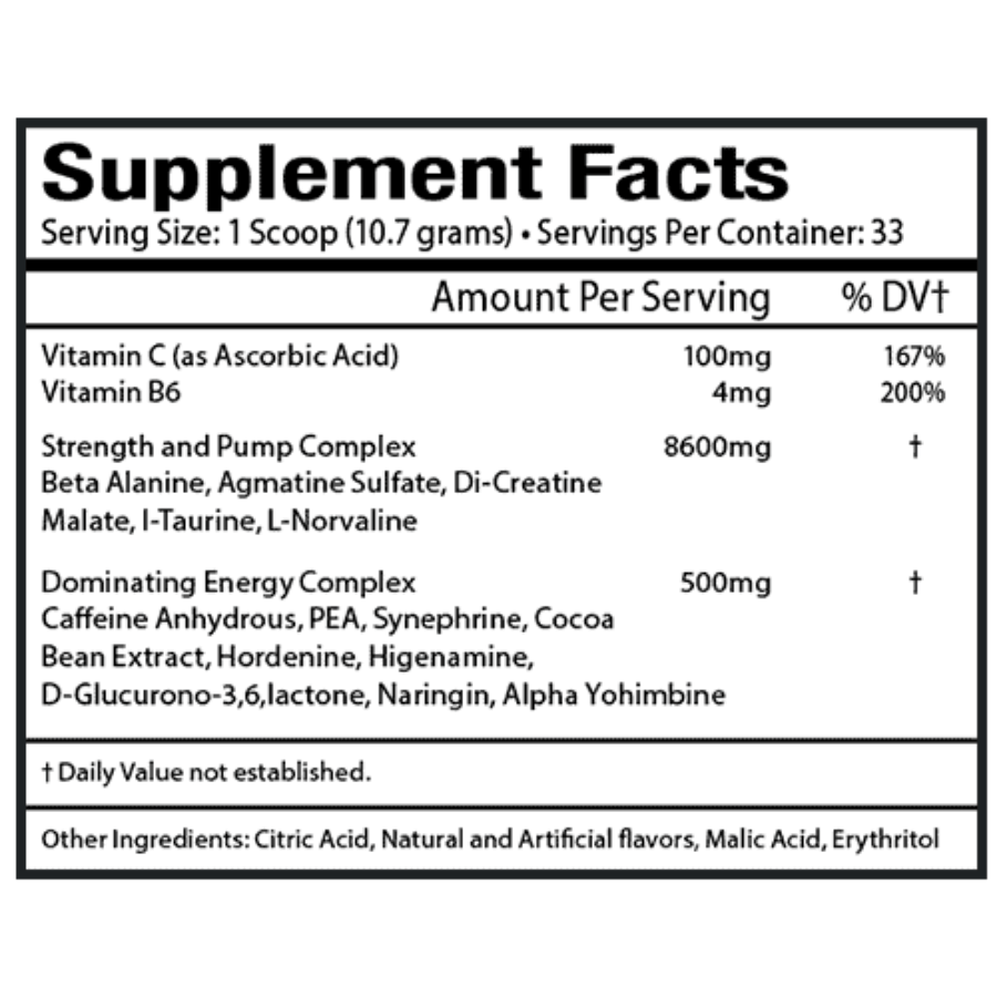 Beta AlanineAgmatine SulfateDi-Creatine Malatel-TaurineL-NorvalineCaffeine AnhydrousPEASynephrineCocoa Bean ExtractHordenineHigenamineD-Glucurono-3,6,lactoneNaringinAlpha Yohimbine