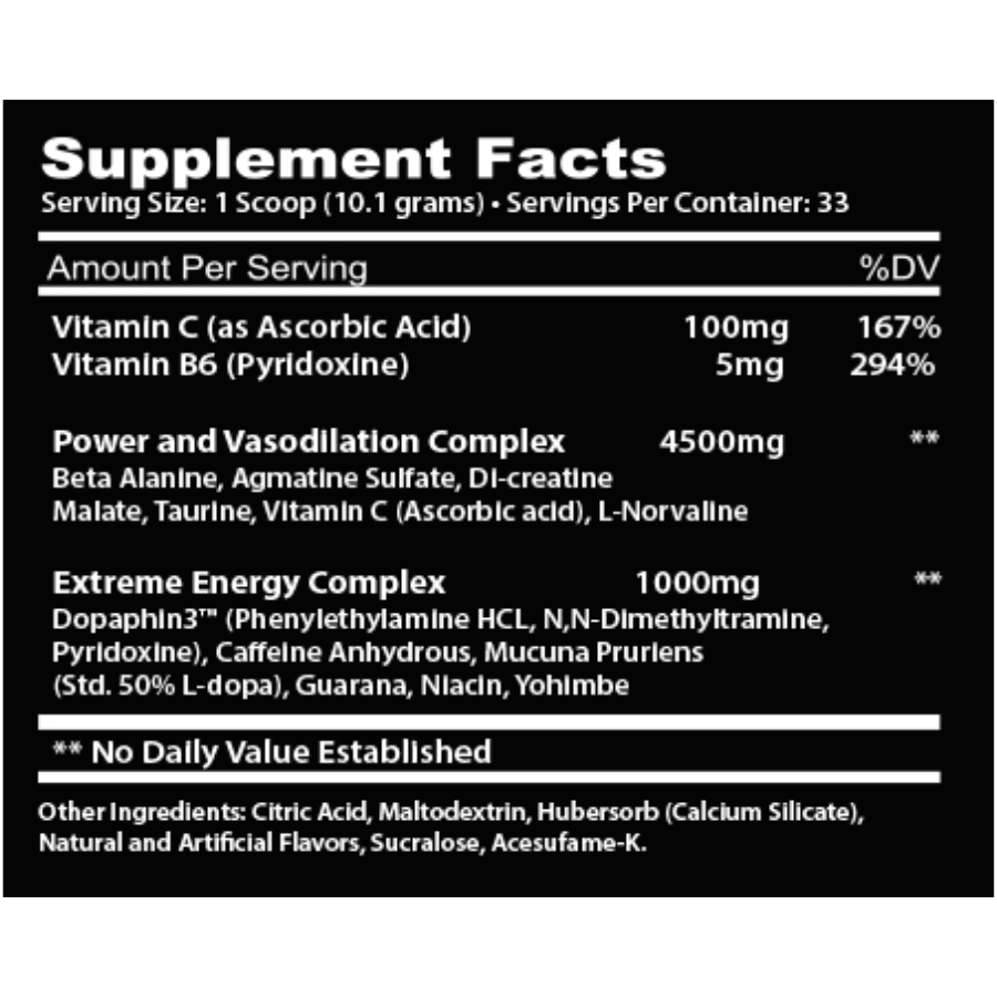 Beta AlanineAgmatine SulfateDI-creatine MalateTaurineVitamin C (Ascorbic acid)L-NorvallineDopaphln3™ (Phenylethylamine HCL, N,N-Dimethyltramlne, Pyridoxine)Caffelne AnhydrousMucuna Prurlens (Std. 50% L-dopa)GuaranaNiaclnYohlmbe
