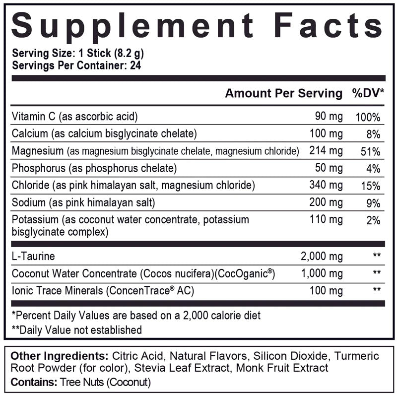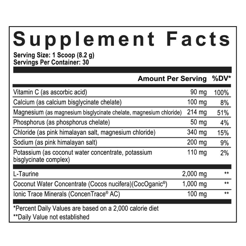 | Potassium (as coconut water concentrate, potassium bisglycinate complex) | 110 mg |