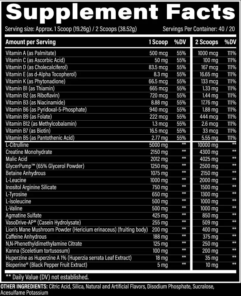 - It features a unique ingredient profile including eria, kanna, creatine, lions mane, and various vitamins, notably excluding beta-alanine.