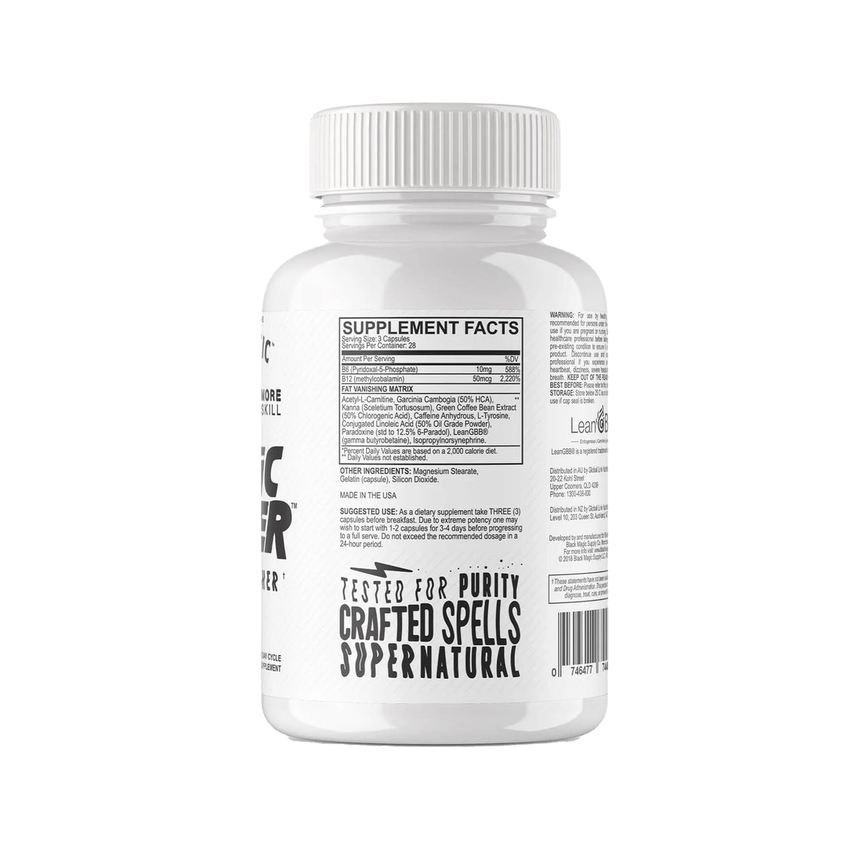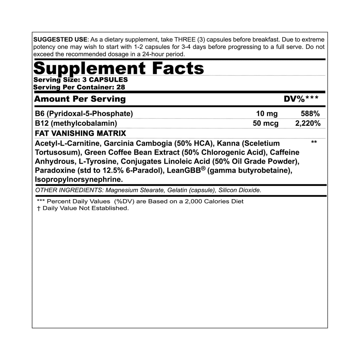 Acetyl-L-CarnitineGarcinia Cambogia (50% HCA)Kanna (Sceletium Tortusosum)Green Coffee Bean Extract (50% Chlorogenic Acid)Caffeine AnhydrousL-TyrosineConjugates Linoleic Acid (50% Oil Grade Powder)Paradoxine (std to 12.5% 6-Paradol)LeanGBB® (gamma butyrobetaine)Isopropylnorsynephrine