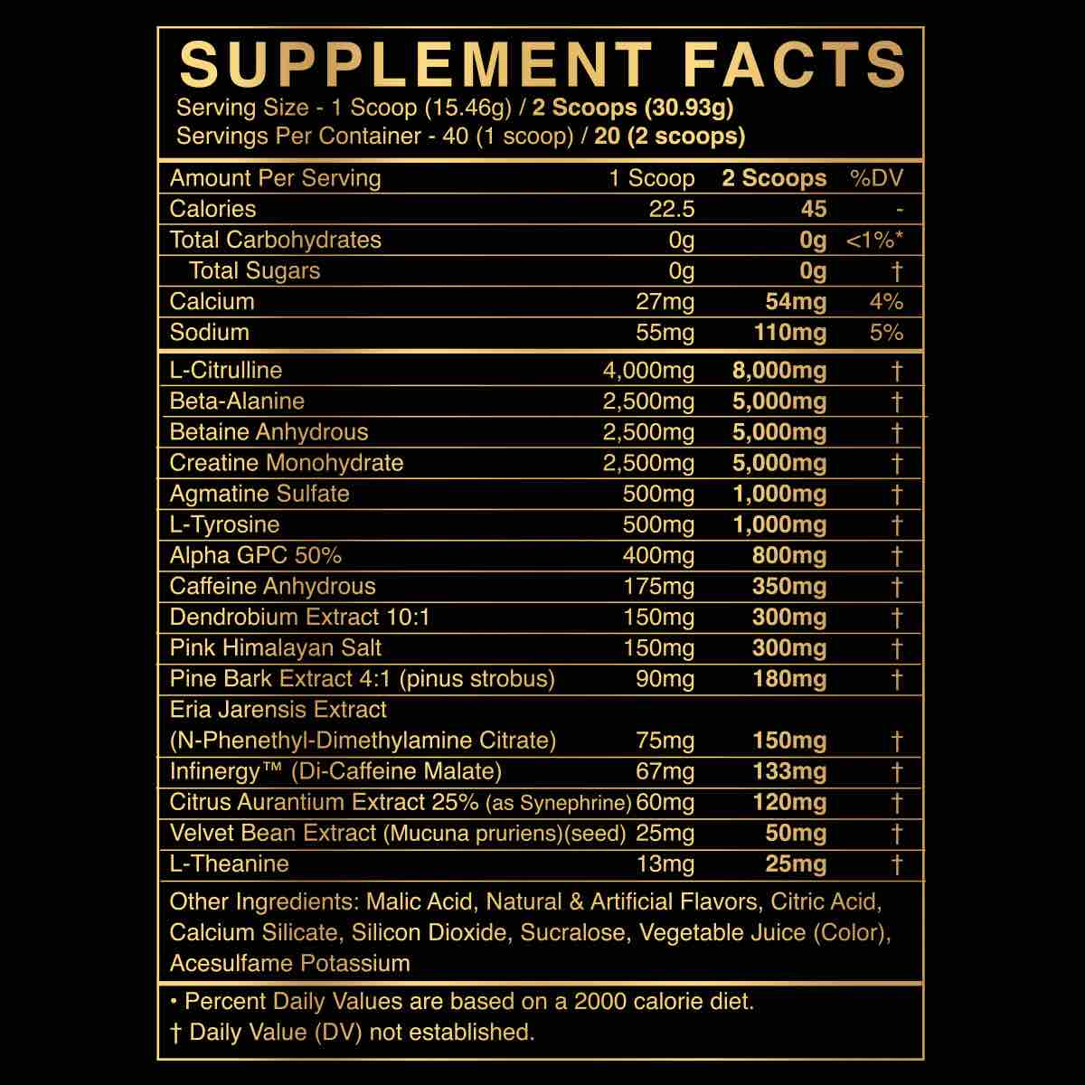 High-octane fuel with 400mg+ of caffeine and potential mild stimulants. Designed for seasoned athletes seeking serious performance enhancement without venturing into exotic territory.