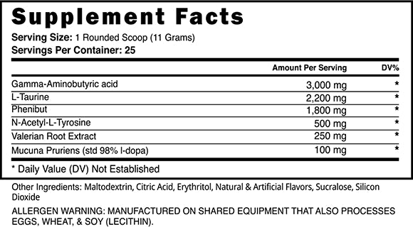 - Contains a blend of ingredients known for their relaxing and sleep-promoting properties, such as Gamma-Aminobutyric acid, Phenibut, and Valerian Root Extract.