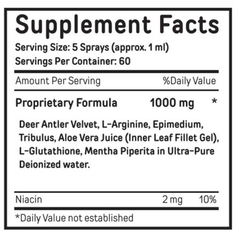 Deer Antler VelvetL-ArginineEpimediumTribulusAloe Vera Juice (Inner Leaf Fillet Gel)L-GlutathioneMentha Piperita in Ultra-Pure Deionized water