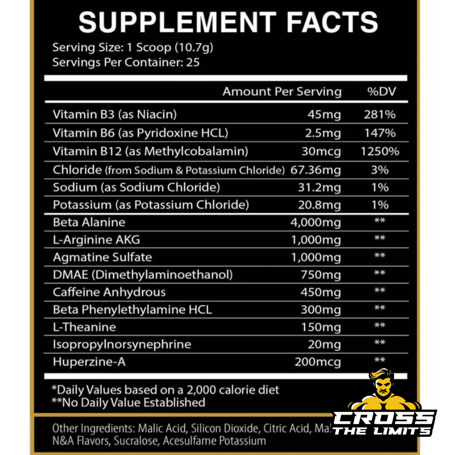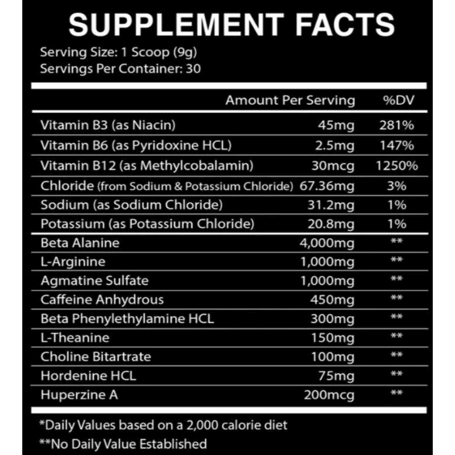 - Contains a blend of stimulants and performance-enhancing ingredients like Beta Alanine, L-Arginine AKG, and Caffeine Anhydrous.