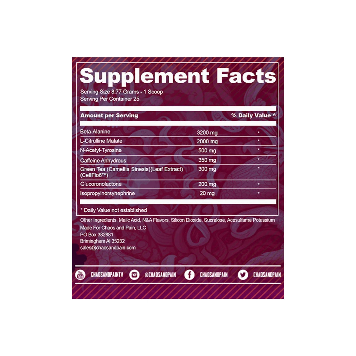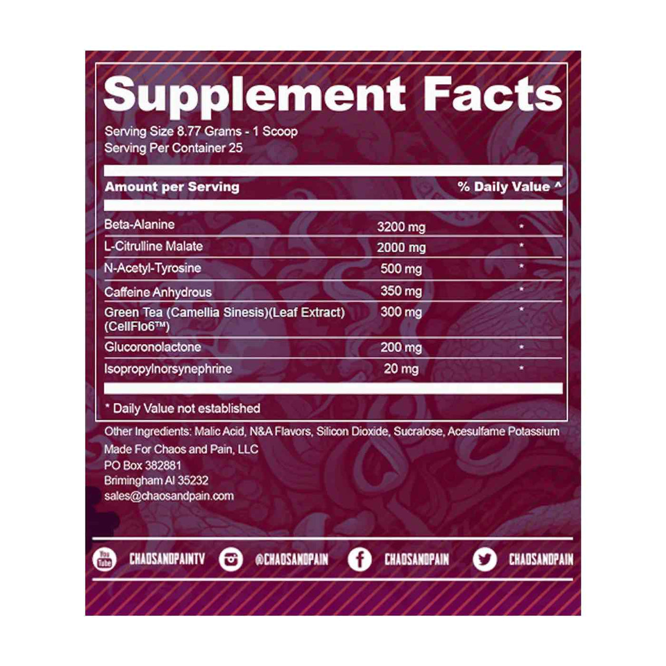 Listed as: Cannibal Riot OG Pre-Workout by Chaos and Pain