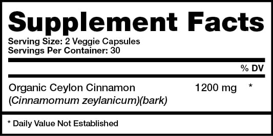 | Organic Ceylon Cinnamon (Cinnamomum zeylanicum)(bark) | 1,200 mg |