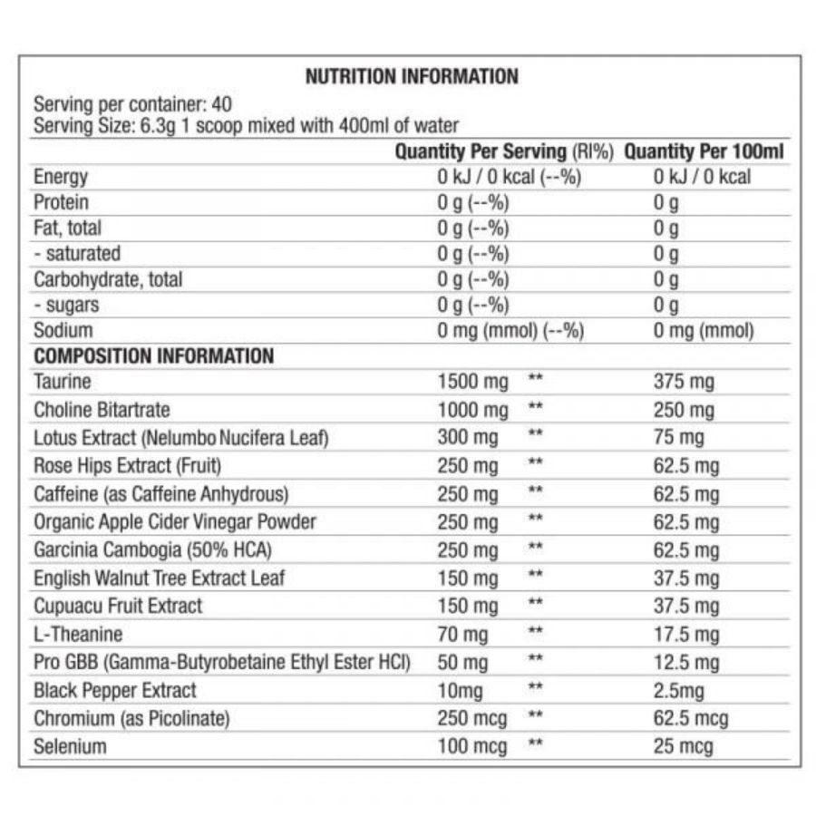 | Caffeine (as Caffeine Anhydrous) | 250 mg |