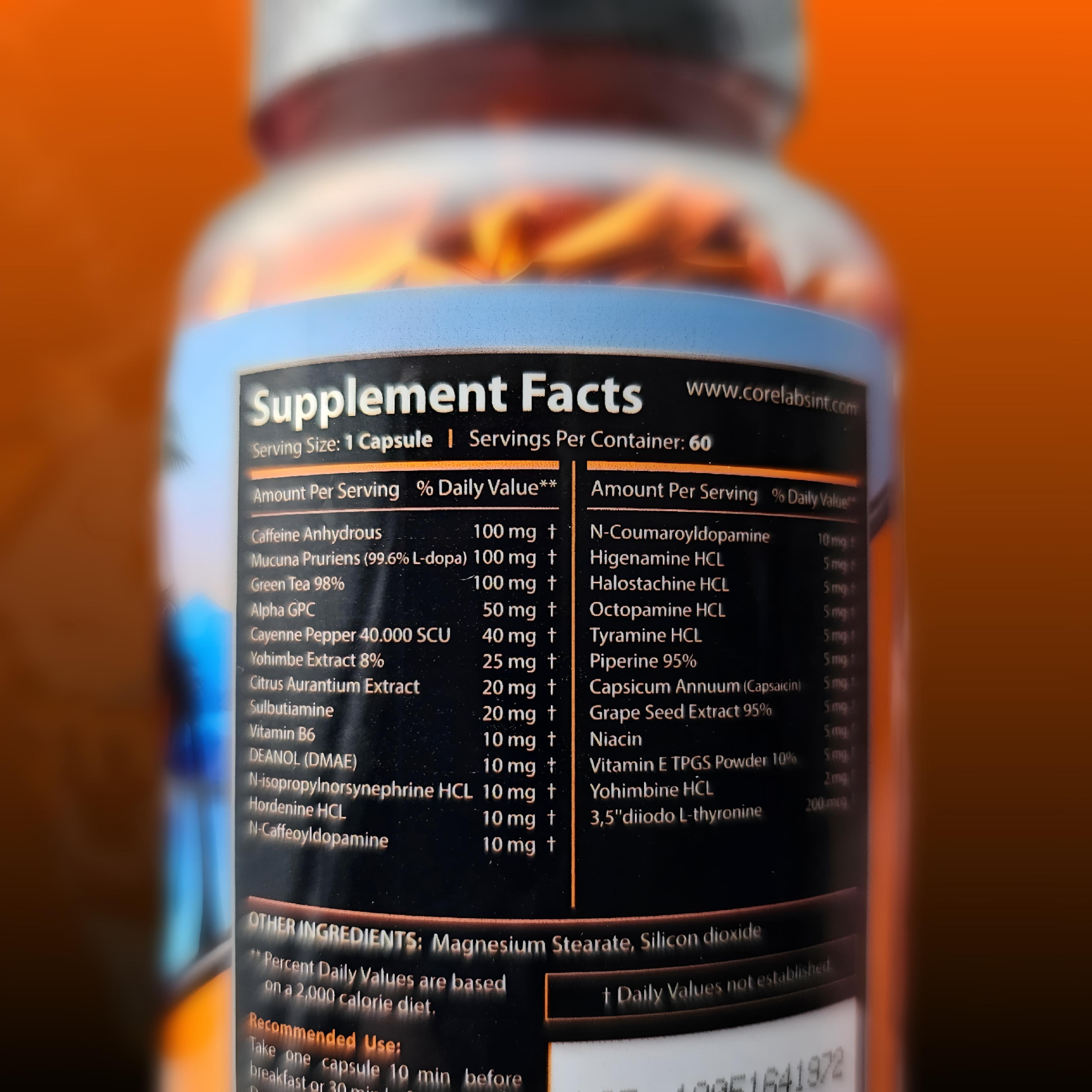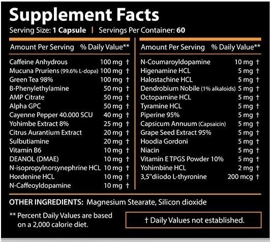 - It features a comprehensive blend of potent thermogenic and stimulant ingredients, including Caffeine, Yohimbe, Synephrine, and Capsaicin.