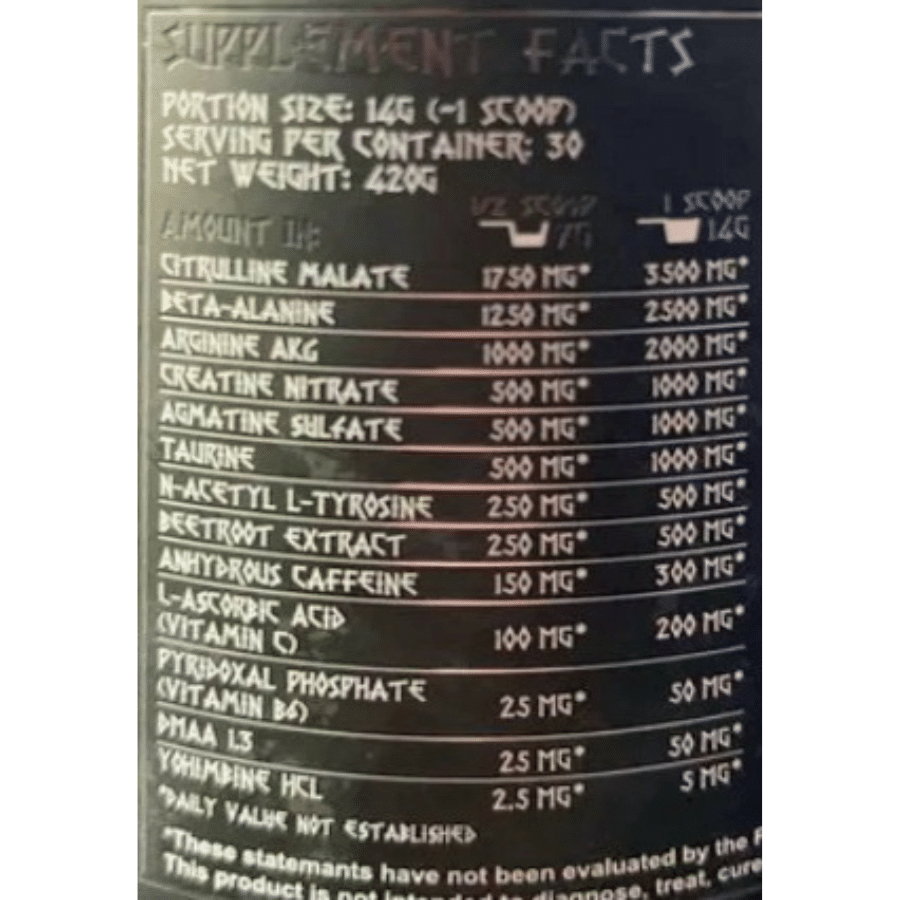 Dark Raven Vikings Rage 420g 2-amino contains 300mg of total caffeine per serving.