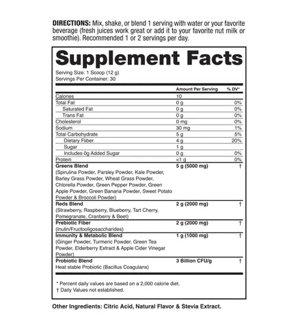 Spirulina PowderParsley PowderKale PowderBarley Grass PowderWheat Grass PowderChlorella PowderGreen Pepper PowderGreen Apple PowderGreen Banana PowderSweet Potato PowderBroccoli PowderStrawberryRaspberryBlueberryTart CherryPomegranateCranberryBeetGinger PowderTurmeric PowderGreen Tea PowderElderberry ExtractApple Cider Vinegar Powder