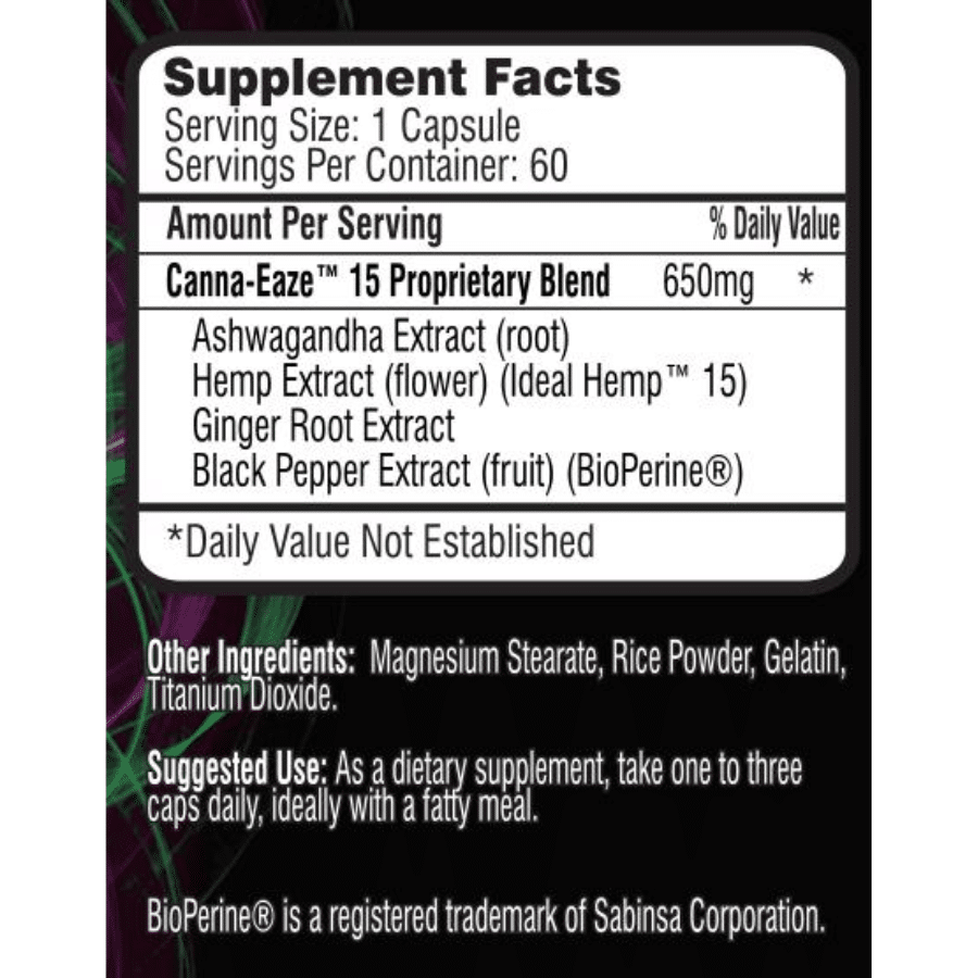 Driven Sports Canna-Eaze 15 60 Capsules contains 0mg of total caffeine per serving.