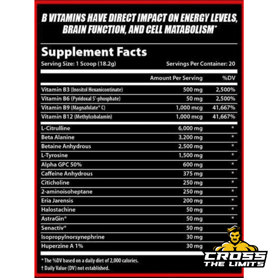 - Contains a robust stimulant complex including Caffeine Anhydrous, 2-aminoisoheptane (DMHA), Eria Jarensis, and Halostachine for intense energy and mood enhancement.