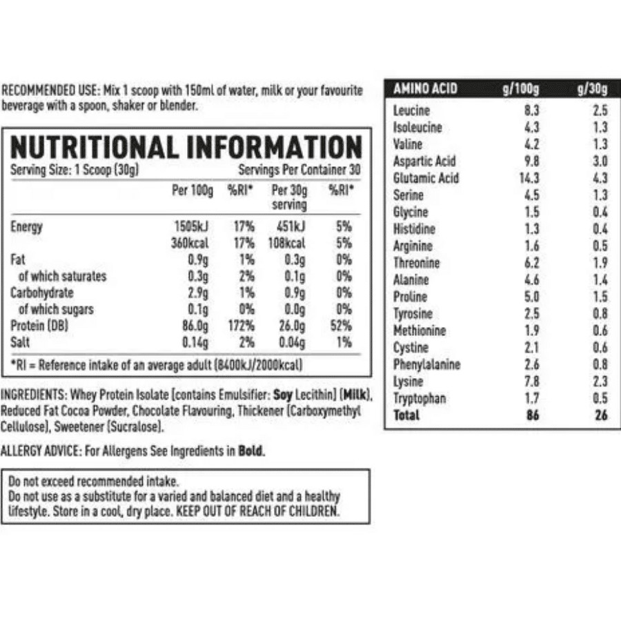 Whey Protein IsolateEmulsifier: Soy LecithinMilkReduced Fat Cocoa PowderChocolate FlavouringThickener (Carboxymethyl Cellulose)Sweetener (Sucralose)