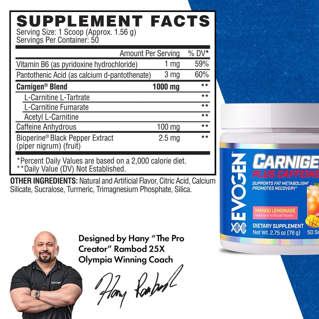 Evogen Carnigen Carnitine contains 0mg of total caffeine per serving.