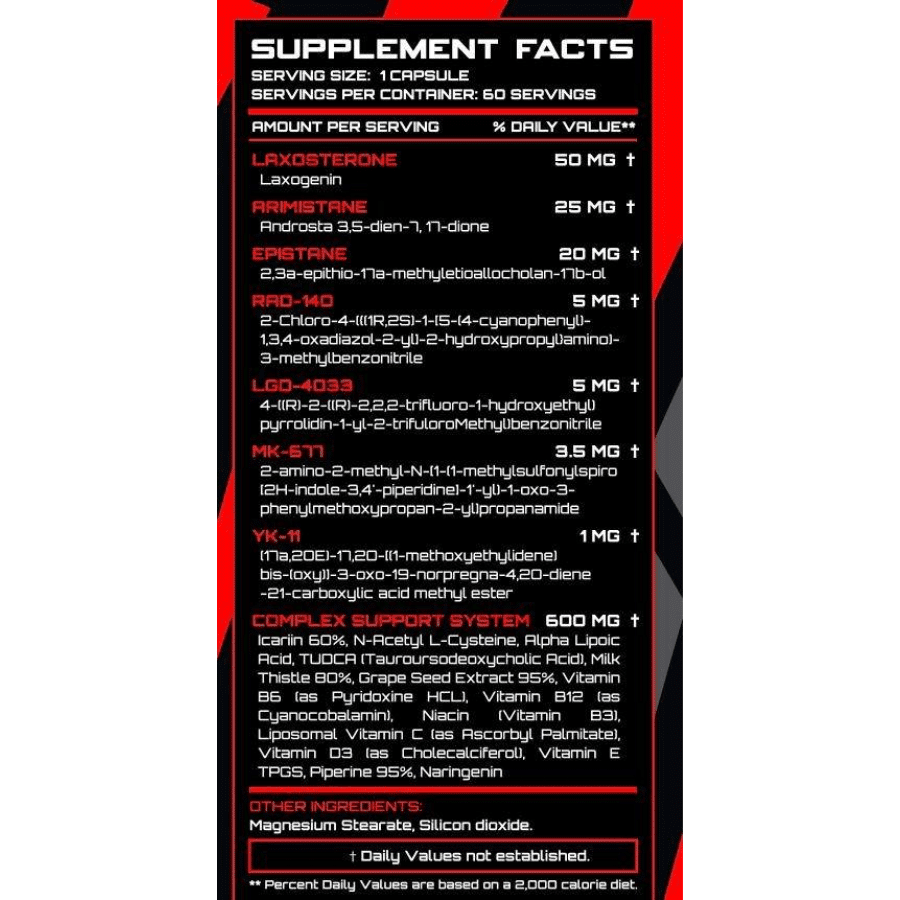 Icariin 60%N-Acetyl L-CysteineAlpha Lipoic AcidTUDCA (Tauroursodeoxycholic Acid)Milk Thistle 80%Grape Seed Extract 95%Vitamin B6 (as Pyridoxine HCL)Vitamin B12 (as Cyanocobalamin)Niacin (Vitamin B3)Liposomal Vitamin C (as Ascorbyl Palmitate)Vitamin D3 (as Cholecalciferol)Vitamin E TPGSPiperine 95%Naringenin