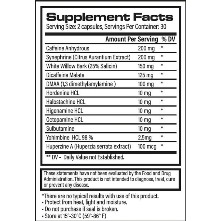 - It features a comprehensive blend of potent stimulants and thermogenic ingredients, including DMAA and Yohimbine HCL, for extreme intensity.