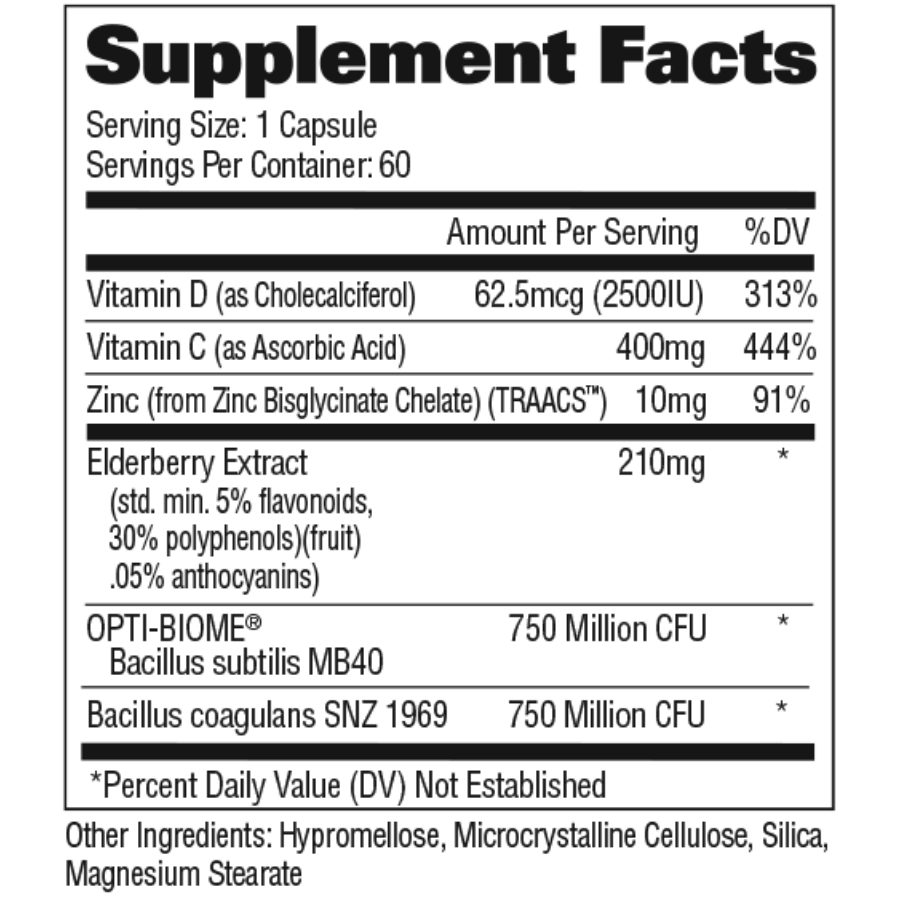 | Elderberry Extract (std. min. 5% flavonoids, 30% polyphenols)(fruit) .05% anthocyanins | 210 mg |