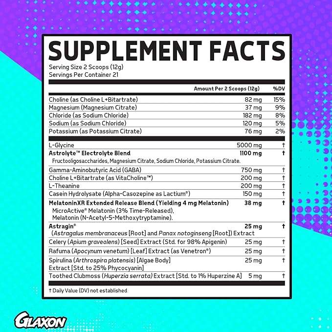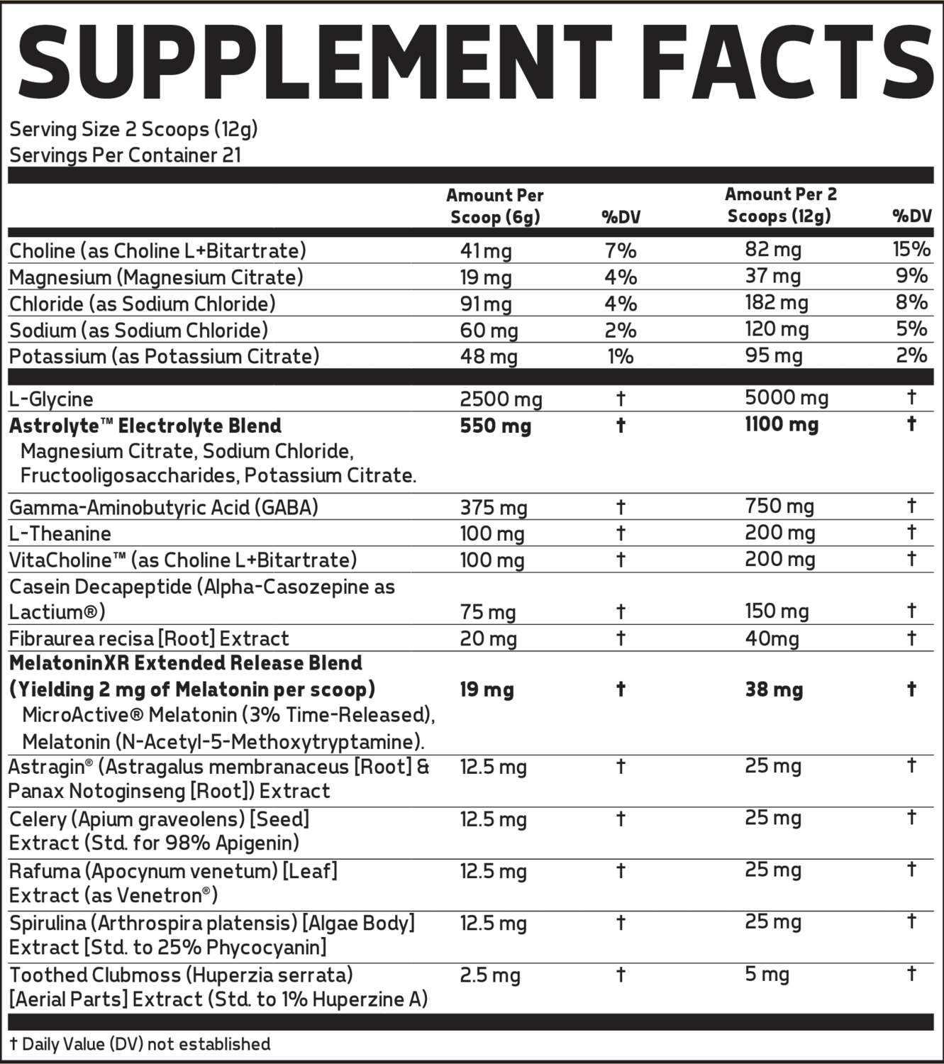 FructooligosaccharidesMagnesium CitrateSodium ChloridePotassium CitrateMicroActive® Melatonin (3% Time-Released)Melatonin (N-Acetyl-5-Methoxytryptamine)Astragalus membranaceus [Root] and Panax notoginseng [Root] ExtractApium graveolens [Seed] Extract (Std. for 98% Apigenin)Rafuma (Apocynum venetum) [Leaf] Extract (as Venetron®)Spirulina (Arthrospira platensis) [Algae Body] Extract [Std. to 25% Phycocyanin]Toothed Clubmoss (Huperzia serrata) Extract [Std. to 1% Huperzine A]