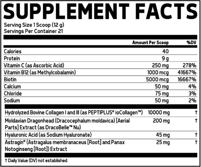 | Hydrolyzed Bovine Collagen I and III (as PEPTIPLUSĀ® ioCollagenā¢) | 10,000 mg |