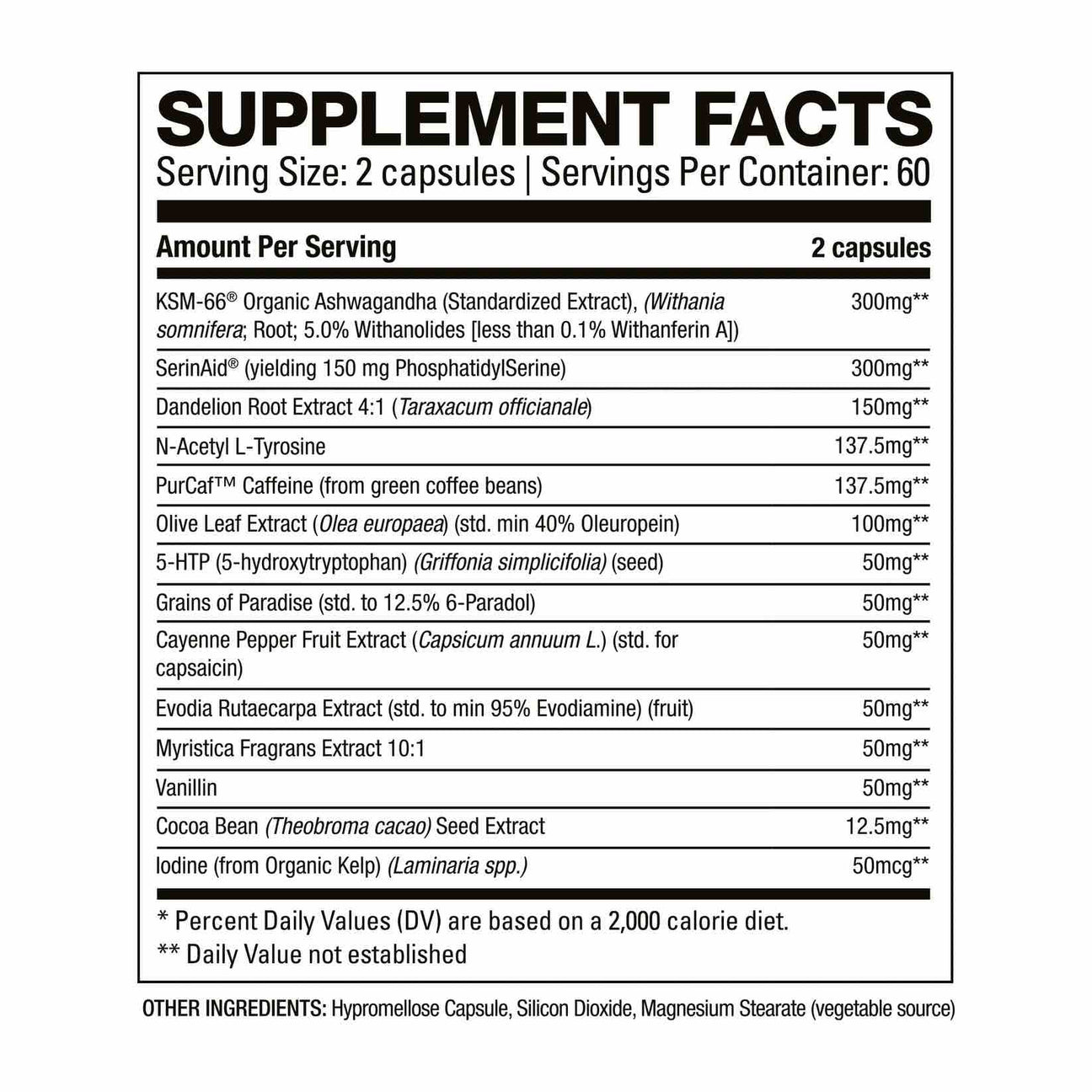 | KSM-66® Organic Ashwagandha (Standardized Extract), (Withania somnifera; Root; 5.0% Withanolides [less than 0.1% Withanferin A]) | 300 mg |