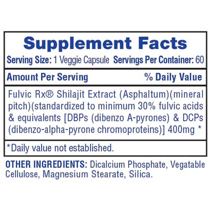 | Fulvic Rx® Shilajit Extract (Asphaltum)(mineral pitch)(standardized to minimum 30% fulvic acids & equivalents [DBPs (dibenzo A-pyrones) & DCPs (dibenzo-alpha-pyrone chromoproteins)]) | 400 mg |
