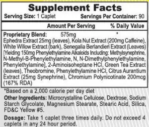Kola Nut Extract (yield = 200 mg Caffeine)White Willow Extract (bark)Senegalia Berlandieri Extract (Leaves) (Yielding 150mg Phenylethylamine Alkaloids Including: Methylsynephrine, N-Methyl-B-Phenylethylamine, N, N-Dimethylphenyllethylamine, Phenylethylamine)2-Aminoisoheptane HClGreen Tea Extract (leaves)TheobrominePhenylethylamine HClCitrus Aurantium Extract (yield = 25mg Synephrine)
