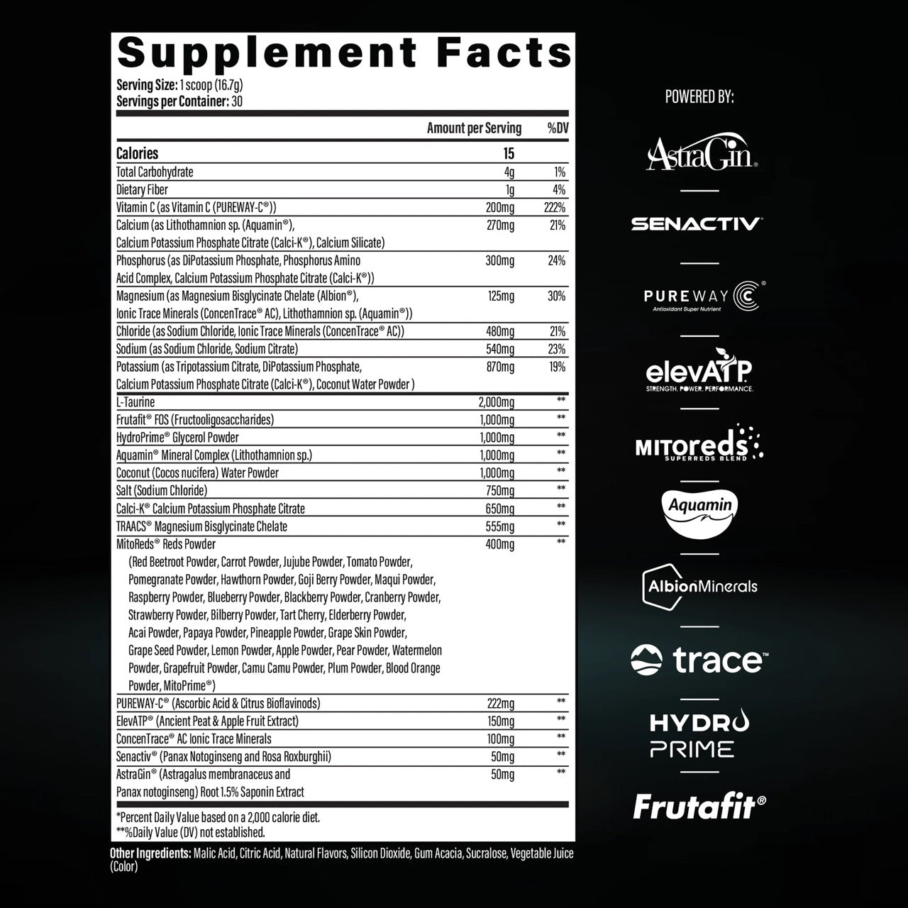 | Potassium (as Tripotassium Citrate, DiPotassium Phosphate, Calcium Potassium Phosphate Citrate (Calci-KĀ®), Coconut Water Powder) | 2,000 mg |
