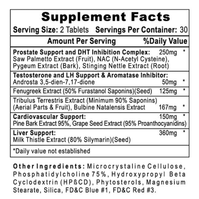 Saw Palmetto Extract (Fruit)NAC (N-Acetyl Cysteine)Pygeum Extract (Bark)Stinging Nettle Extract (Root)Tribulus Terrestris Extract (Minimum 90% Saponins) (Aerial Parts & Fruit)Bulbine Natalensis ExtractPine Bark Extract 95%Grape Seed Extract (95% Proanthocyanidins)