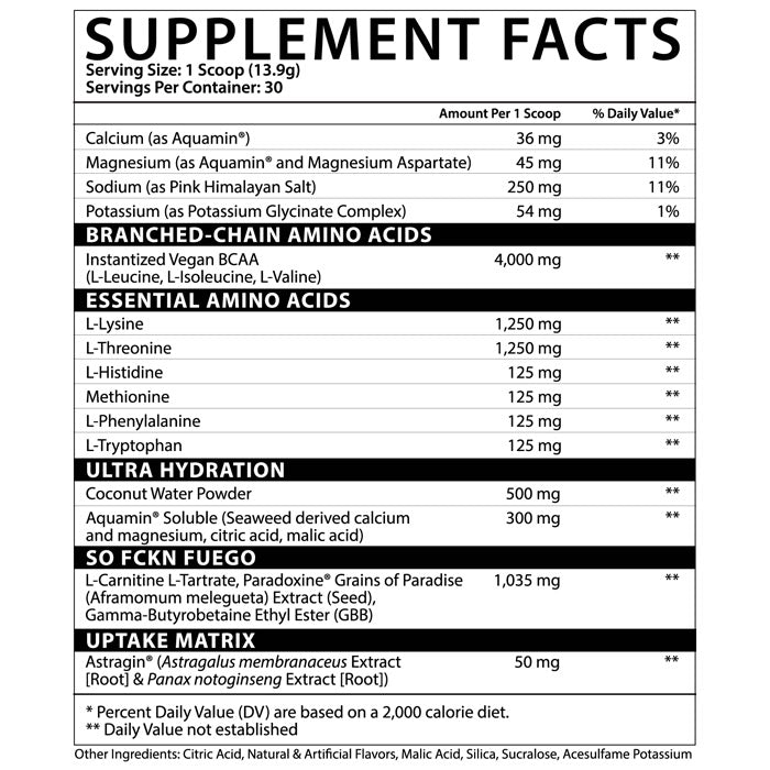 - Amino Fuego delivers a comprehensive blend of essential amino acids (EAAs) and branched-chain amino acids (BCAAs) to support muscle recovery and growth.