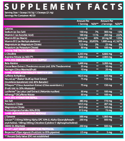 | ENDLESS™ Electrolyte Blend, (as Potassium Citrate 823mg, Sodium Citrate 630mg, DiMagnesium Malate 158mg) | 3,222 mg |