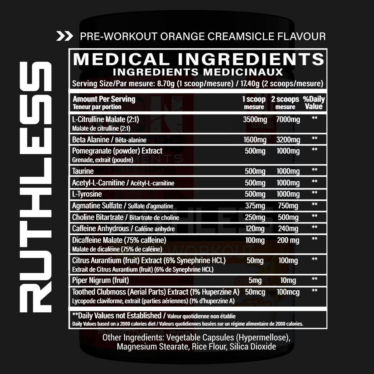 Iron Brothers Ruthless contains 390mg of total caffeine per serving.