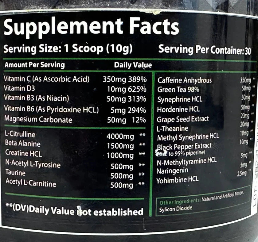 - The formula includes L-Citrulline for pumps, Beta Alanine for endurance, Creatine HCL for strength, and N-Acetyl L-Tyrosine for cognitive focus.
