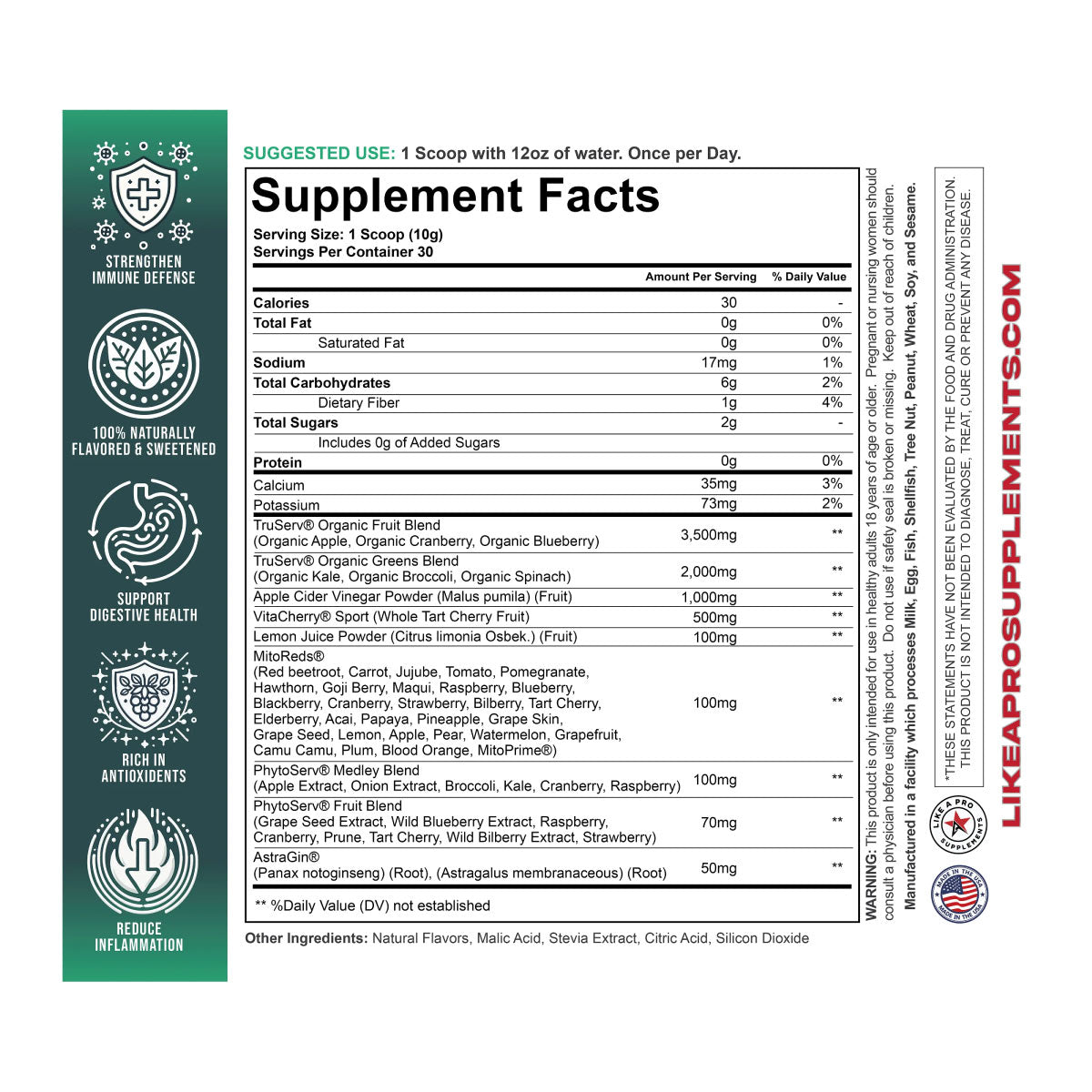 Organic AppleOrganic CranberryOrganic BlueberryOrganic KaleOrganic BroccoliOrganic SpinachRed beetrootCarrotJujubeTomatoPomegranateHawthornGoji BerryMaquiRaspberryBlueberryBlackberryCranberryStrawberryBilberryTart CherryElderberryAcaiPapayaPineappleGrape SkinGrape SeedLemonApplePearWatermelonGrapefruitCamu CamuPlumBlood OrangeMitoPrime®Apple ExtractOnion ExtractBroccoliKaleCranberryRaspberryGrape Seed ExtractWild Blueberry ExtractRaspberryCranberryPruneTart CherryWild Bilberry ExtractStrawberryPanax notoginseng (Root)Astragalus membranaceous (Root)