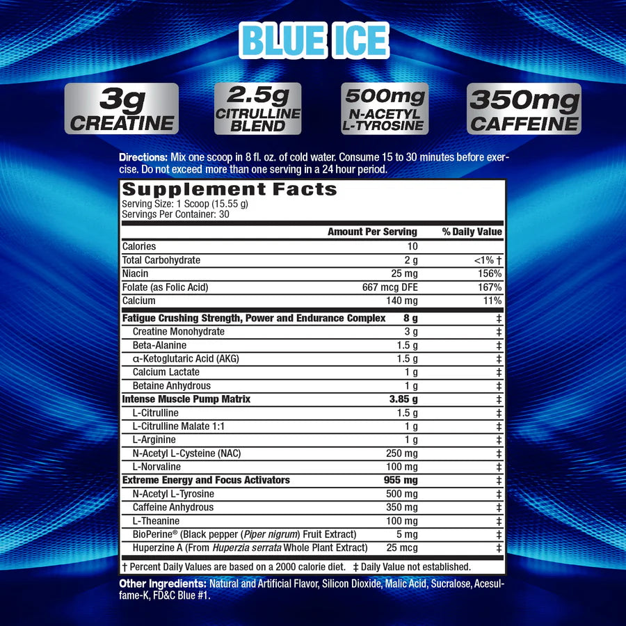 Creatine MonohydrateBeta-Alanineα-Ketoglutaric Acid (AKG)Calcium LactateBetaine AnhydrousL-CitrullineL-Citrulline Malate 1:1L-ArginineN-Acetyl L-Cysteine (NAC)L-NorvalineN-Acetyl L-TyrosineCaffeine AnhydrousL-TheanineBioPerine® (Black pepper (Piper nigrum) Fruit Extract)Huperzine A (From Huperzia serrata Whole Plant Extract)