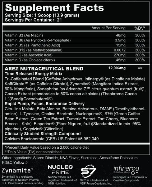 Caffeine AnhydrousInfinergy® (as Dicaffeine Malate)KaffCitrate™ (as Caffeine Citrate)Zynamite® (Mangifera Indica Extract, 60% Mangiferin)Synephrine [as Advantra Z™ citrus quantum extract (fruit)]Cocoa Extract (standardize to 50% cocoa alkaloids) (Theobroma Cacao L.)(Seed)(Cocoabuterol®)Citrulline MalateBeta AlanineBetaine AnhydrousDMAE (Dimethylethanolamine)L-TyrosineCholine BitartrateNucleoprime®S7® (Green Coffee Bean Extract, Green Tea Extract, Tumeric Extract, Tart Cherry, Blueberry, Broccoli, Kale)Bioperine® (Piper Nigrum, fruit)(Standardized to min. 95% piperine)Cognizin® (Citicoline)Calcium Fructoborate (CFB) US Patent #5,962,049