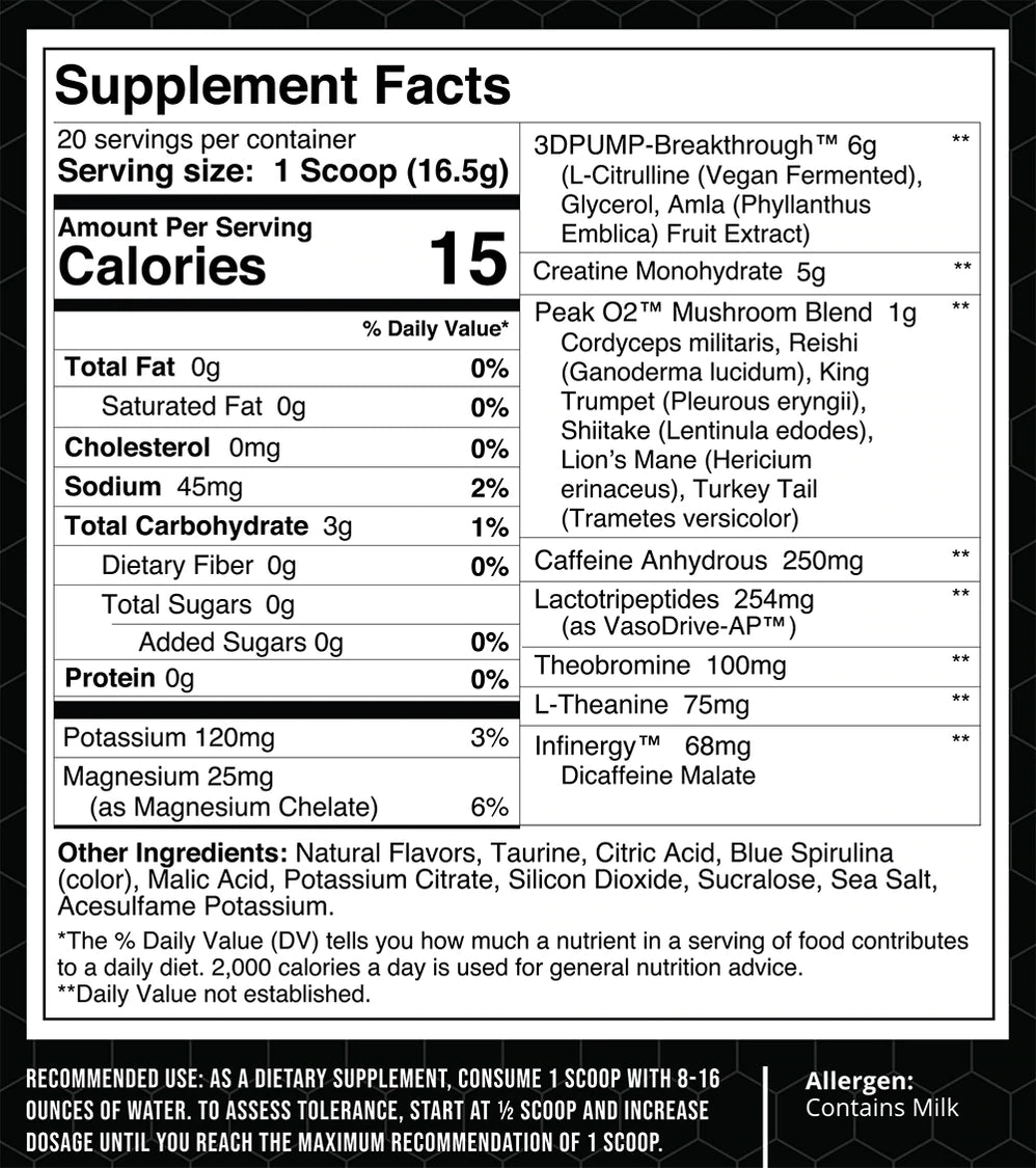 L-Citrulline (Vegan Fermented)GlycerolAmla (Phyllanthus Emblica) Fruit ExtractCordyceps militarisReishi (Ganoderma lucidum)King Trumpet (Pleurotus eryngii)Shiitake (Lentinula edodes)Lion's Mane (Hericium erinaceus)Turkey Tail (Trametes versicolor)