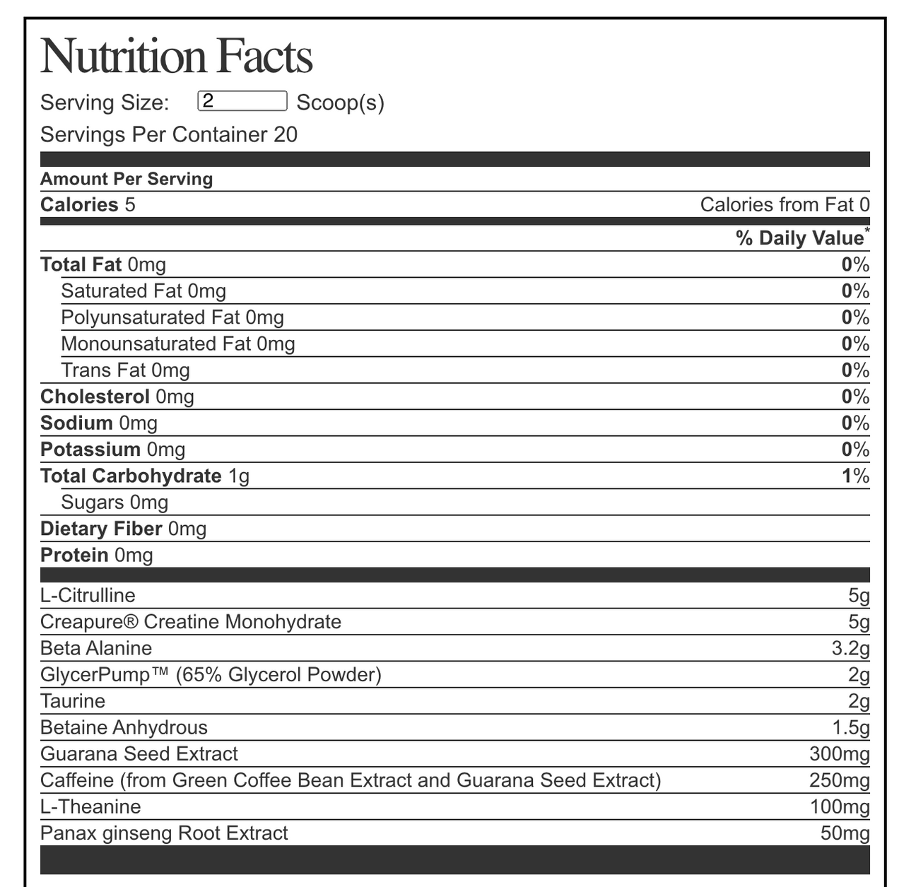 | Caffeine (from Green Coffee Bean Extract and Guarana Seed Extract) | 250 mg |