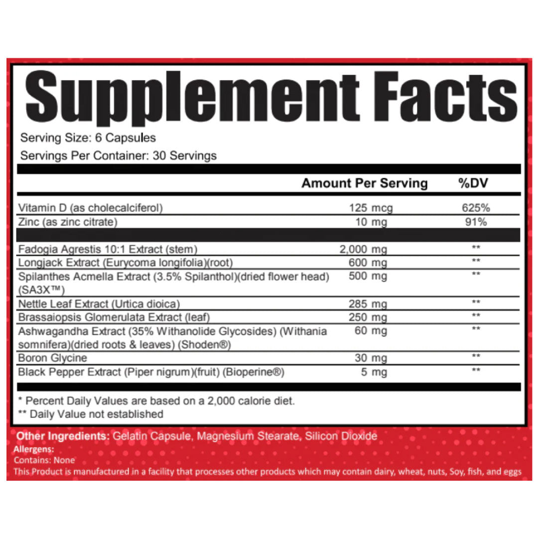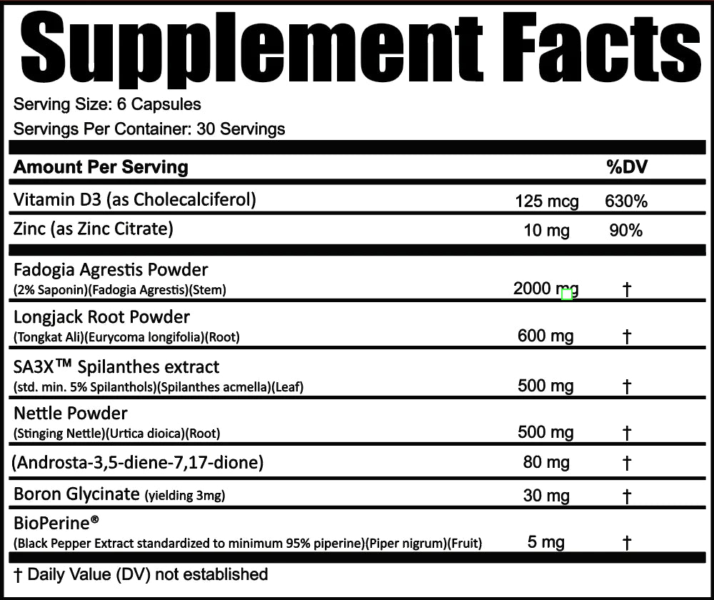 | Fadogia Agrestis 10:1 Extract (stem) | 2,000 mg |