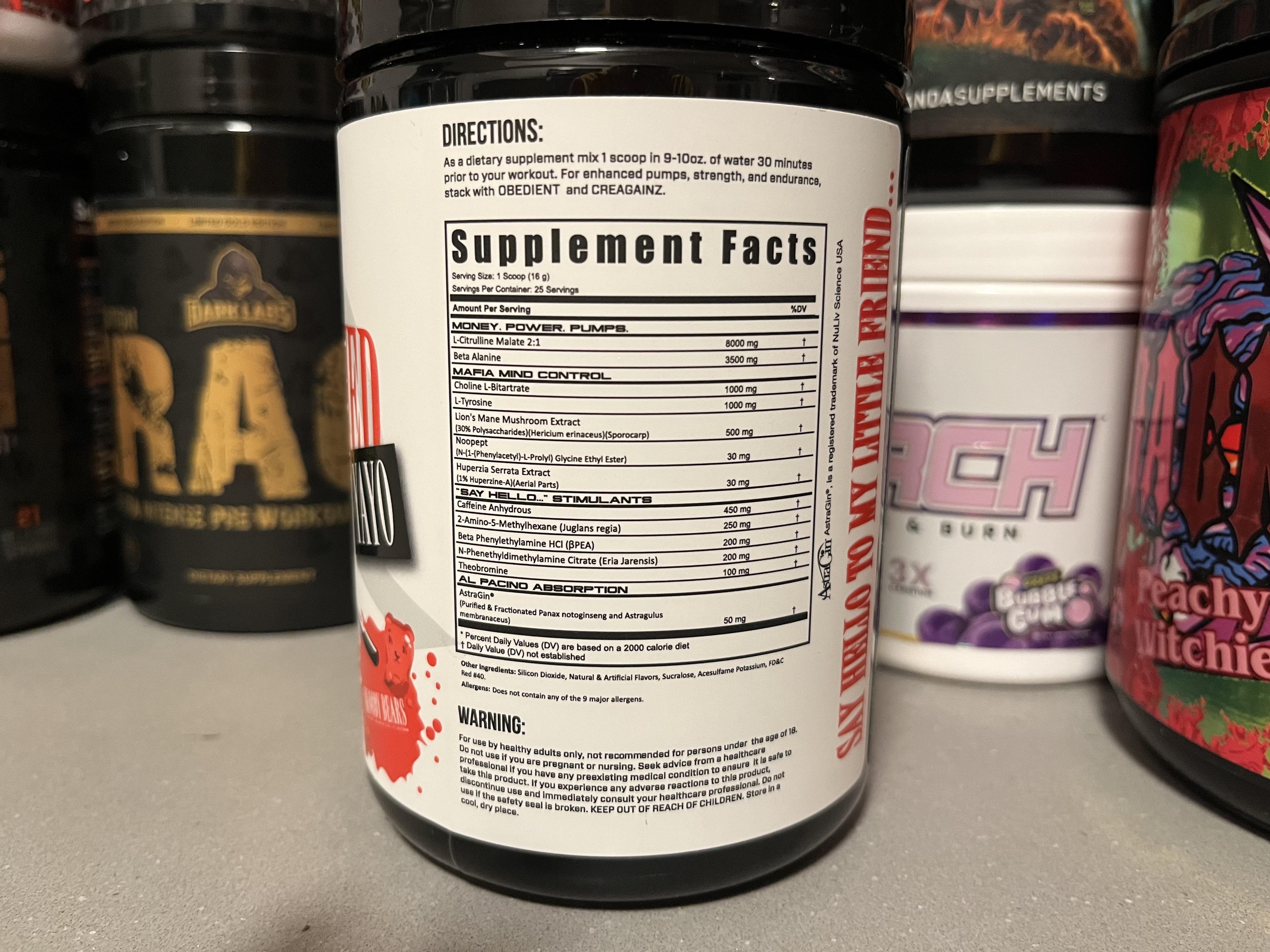 "This is hands down one of best DMHA pres out there, that has no L-theanine, GABA or Kanna any other crap. ... Energy builds up slowly, but it takes you from zero to 100 for sure. Best way I can describe it that, it will make you LOCKED IN. Super focus , drive , aggressive mood elevation are the main points. DMHA feels legit, it’s not euphoric. Mind muscle connection are outstanding, pumps are awesome. ... High energy is sustained throughout the workout, you just don’t feel any fatigue or pain. It’s not a drug addict stim junkie pre, you are not feeling high or buzzing. Just working hard and training as brutal as possible,which I really really loved."