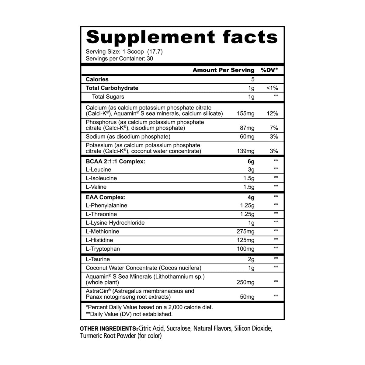 | Potassium (as calcium potassium phosphate citrate (Calci-K®), coconut water concentrate) | 139 mg |